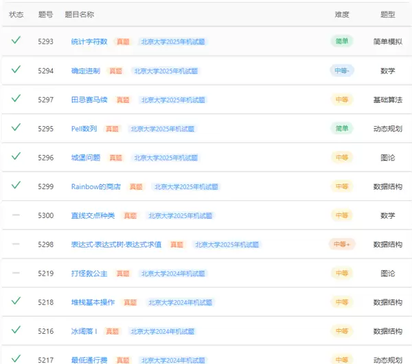 N 诺 DreamJudge 题库收录了多所高校的历年计算机考研与保研上机真题,搜索“北京大学”即可快速筛选出该校相关题目。所有题目均在考试大纲范围内,并支持按难度排序,便于针对性练习。配合《计算机考研机试攻略》使用效果更佳,书中例题可通过题号直接在题库中定位查找。