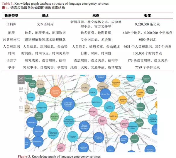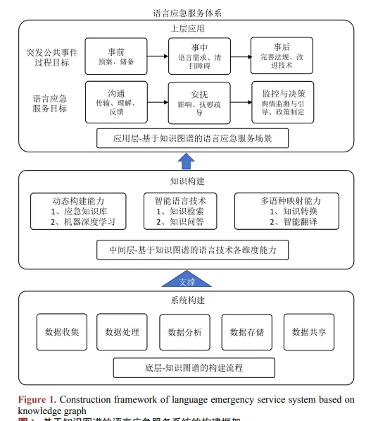 语言应急服务系统致力于通过增强信息处理效率与整合多源知识资源,提升突发事件中语言沟通、本地化翻译、舆情监测及辅助决策的能力。本研究提出一种基于知识图谱的系统构建方法,采用基础设施层、知识层和应用层的三层架构设计。首先,利用“实体–关系–实体”三元组形式对海量语言应急相关知识进行结构化存储,实现知识图谱的系统化建设。其次,围绕实际服务需求,提炼出动态知识构建、智能语言处理与多语言映射三大核心能力,推动语言应急服务向智能化发展。随后,设计并实现了四类典型应急场景的应用模式,全面响应紧急情况下的语言服务诉求。实验结果表明,该系统显著提高了应急响应效率,有效降低了资源浪费与灾害损失。研究成果为提升语言应急服务能力与保障应急响应可靠性提供了可行路径。