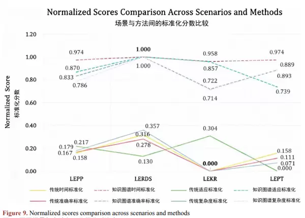 从图9可以看出,在所有测试场景中,基于知识图谱的方法综合评分均优于传统方法。在多数指标和应用场景下,知识图谱方法(以虚线表示)的表现持续领先于传统方法(实线表示)。尤其在准确率这一关键指标上,两者差距尤为明显。特别是在语言应急知识库构建场景中,知识图谱方法的得分远超传统方式,充分证明了本研究所提系统的有效性与先进性。