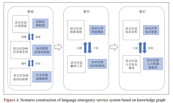 语言应急服务的核心在于应对突发公共事件时的任务落地能力。知识图谱在其中的作用贯穿于任务生成到执行的全过程。该过程主要包括以下步骤:第一,明确突发事件在事前、事中、事后各阶段的目标,并界定语言服务的具体方向,如跨语言沟通协调、公众情绪安抚、灾情监测预警以及应急决策支持等;第二,依托系统所具备的三项关键能力——动态构建能力、智能语言处理能力和多语言映射能力,支撑复杂情境下的语言服务需求;第三,在上述能力基础上完成具体应急任务的部署与实施。