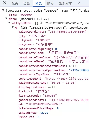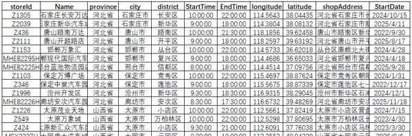 获取的主要数据字段包括:storeFacilitiesId(门店id)、zeekrCoordinateName(门店名称)、province(省)、city(市)、district(县)、roadShowDailyOpeningStartTime(营业开始时间)、roadShowDailyOpeningEndTime(营业结束时间)、shopAddress(门店地址)、roadShowStartDate(开业时间)、lng & lat(地理坐标)。其他非核心字段在此略去;