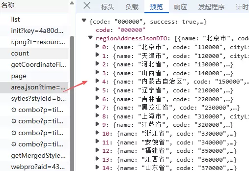 经页面测试可知,只要输入市级行政区编码即可获取该层级下的全部门店数据。结合标头信息可判断,数据是基于市级行政区编码进行查询的。因此,首先需获取全国所有省市县的行政区编码列表,并将其保存至本地,后续便可利用该映射表遍历并抓取全国极氪门店数据。