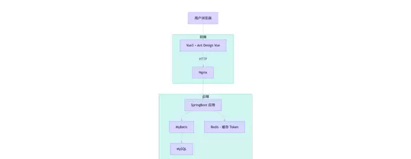 系统采用 B/S 架构模式,前后端完全分离。前端基于 Vue3 与 Ant Design Vue 搭建响应式交互界面;后端通过 SpringBoot 提供 RESTful API 接口,并利用 JWT 实现用户身份认证与权限控制。
