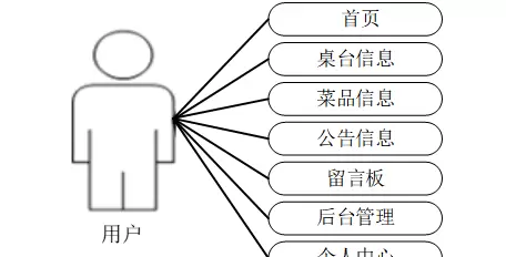 用户登录后可访问的功能主要包括:首页浏览、桌台信息查看、菜品信息查询、公告信息阅读、留言板互动、后台入口(需权限)和个人中心管理等。用户功能用例如图3-2所示。