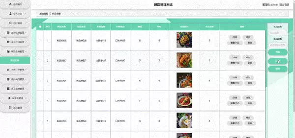 管理员可进入“菜品信息管理”功能模块,在菜品信息页面中,通过填写菜品名称、选择菜品类型等方式实现对菜品列表的查询、新增或删除操作。此外,针对已存在的菜品信息,还可进一步进行详情查看、修改信息、浏览用户评论或执行删除操作,界面展示如图5-10所示: