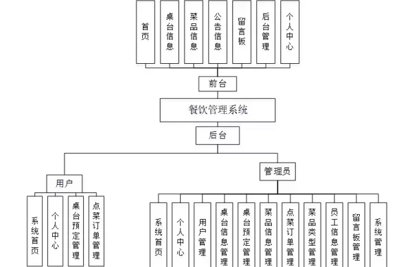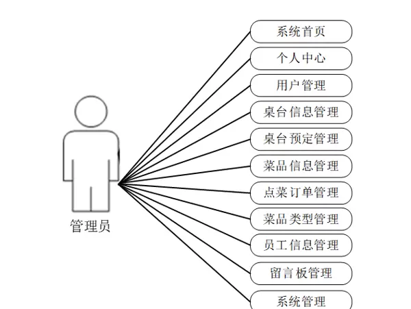 管理员登录后可使用的主要功能包括:系统首页、个人中心、用户管理、桌台信息管理、桌台预定管理、菜品信息管理、点菜订单管理、菜品类型管理、员工信息管理、留言板管理以及系统管理等。管理员的功能范围如图3-1所示。