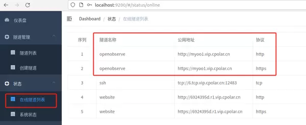 更新完毕后,刷新“在线隧道列表”,此时可见公网地址已变更为固定格式的二级子域名地址。