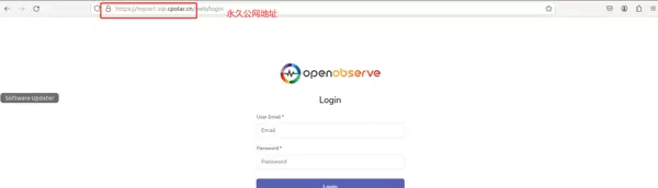 最后,在任意设备的浏览器中输入该固定地址进行访问,确认可以正常加载 OpenObserve 页面。至此,一个永久有效的公网访问链接已成功配置完成,今后可随时远程访问本地部署的服务。
