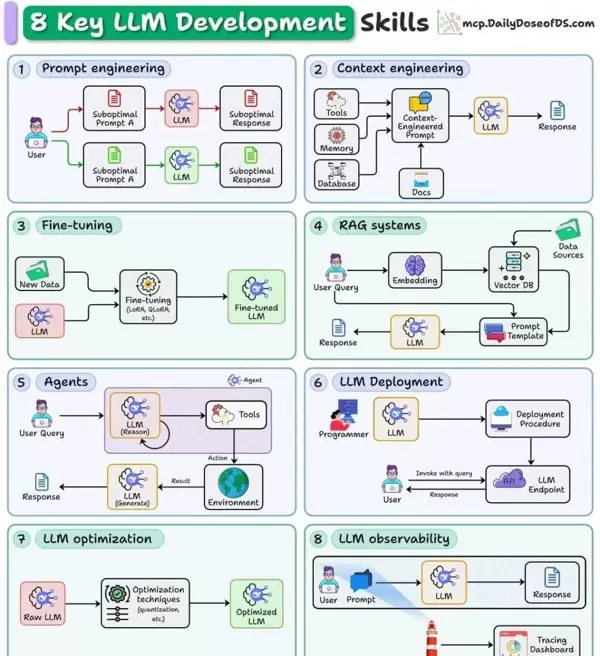 驾驭大语言模型(LLM)绝非仅靠“写好提示词”就能胜任。要构建生产级 LLM 系统,需掌握以下八项关键技术。以下是通俗解读与核心要点: