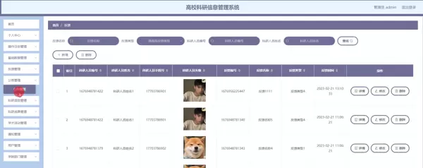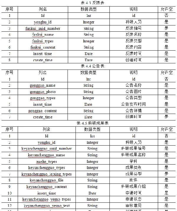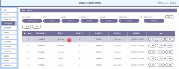 本系统涵盖多个核心管理模块,包括科研项目管理、科研成果管理、学术活动组织、通知公告发布、学院与部门信息维护、科研人员档案管理、字典配置、操作日志记录以及用户反馈处理等功能。系统后端采用MySQL这一广泛应用的关系型数据库作为数据存储中心,保障了数据的安全性、完整性与可备份性,提升了整体数据管理的可靠性。
