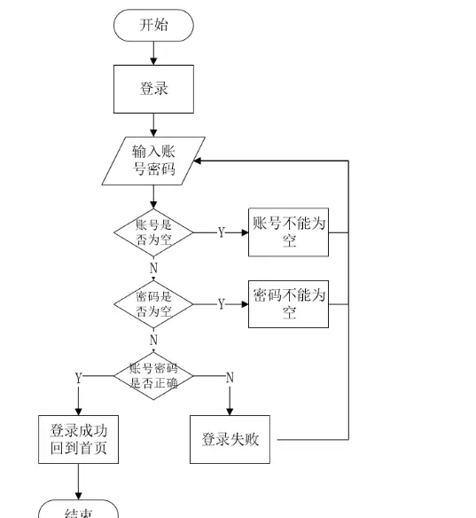 用户完成注册后,进入登录界面。系统首先判断输入的账号和密码是否为空,若为空则拒绝提交。非空情况下,先验证账号是否存在,若存在则进一步比对输入密码与数据库中对应账号加密后的密码是否一致。只有当两者完全匹配时,用户方可成功登录并跳转至首页;否则,登录失败,页面返回至登录界面并提示错误信息。