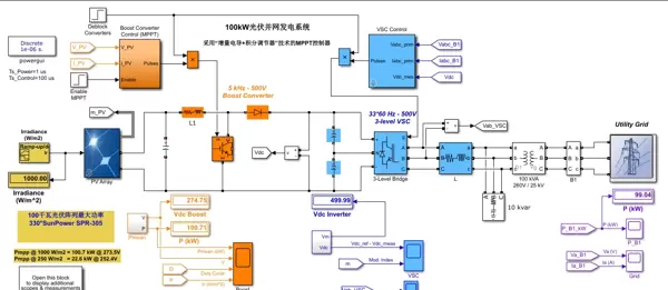 综合以上两大核心技术——基于“增量电导+积分调节器”的MPPT算法与基于dq解耦的VSC并网控制,所建立的100kW光伏并网发电系统在MATLAB/Simulink环境中实现了较为真实的动态行为模拟。