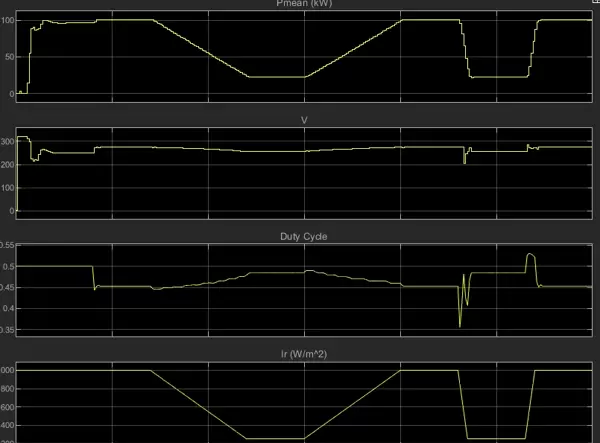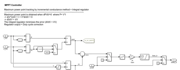 为了最大化太阳能转换效率,MPPT控制器的作用不可忽视。本模型采用了“增量电导法”作为基础算法,并引入积分调节机制以提升稳态精度和抗干扰能力。