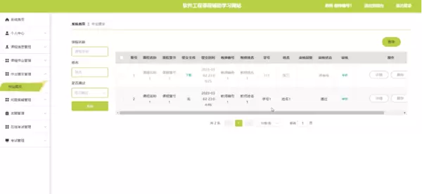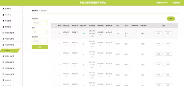 作业提交管理功能:管理员可在作业提交管理页面根据课程名称、学生姓名及审核状态(是否通过)进行数据筛选,查看学生提交情况,并支持删除无效提交记录或查看详情。作业提交管理界面如图5-10所示。