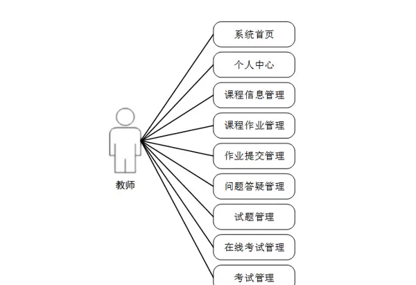教师登录后可使用的功能模块包括:系统首页、个人中心、课程信息管理、课程作业管理、作业提交管理、问题答疑管理、试题管理、在线考试管理、考试管理等功能。教师端功能用例图见图3-2。