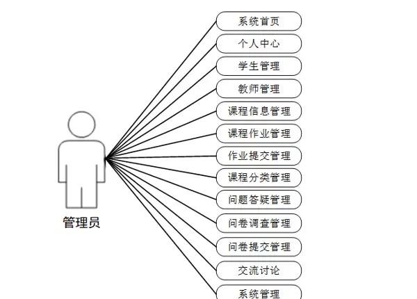 管理员登录后可使用的功能模块包括:系统首页、个人中心、学生管理、教师管理、课程信息管理、课程作业管理、作业提交管理、课程分类管理、问题答疑管理、问卷调查管理、问卷提交管理、交流讨论管理、系统管理等。其对应的功能用例图如图3-1所示。