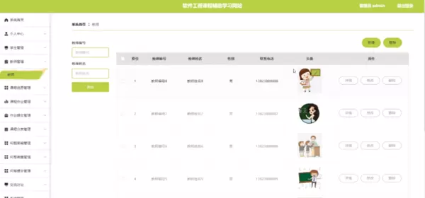 教师管理功能:管理员可在教师管理页面依据教师编号或姓名检索教师列表,执行添加、删除操作,并对教师个人信息进行查看、修改或删除处理。教师管理界面如图5-9所示。