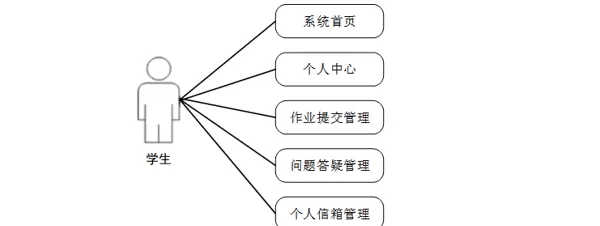 学生登录后可操作的功能主要包括:系统首页、个人中心、作业提交管理、问题答疑管理、个人信箱管理等。学生端功能用例图如图3-3所示。
