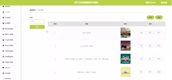 管理员进入系统后,可对多个管理功能进行操作。在系统管理模块中,可通过输入标题对公告信息列表进行查询、新增或删除,并支持对公告详情进行查看、修改或删除;同时,也可对轮播图管理进行相应的维护操作。具体界面如图5-13所示: