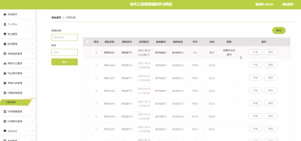 当管理员选择问题答疑管理时,将跳转至对应页面。在此页面中,可通过填写课程名称和姓名实现问题答疑记录的检索或删除操作,并根据实际需求,对相关答疑信息进行详情查看或删除处理。界面展示见图5-11: