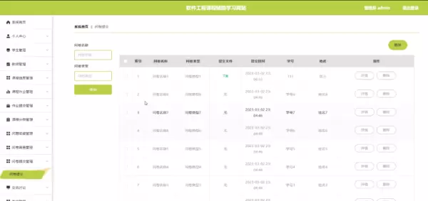 对于问卷提交管理,管理员可在页面中通过填写问卷名称与选择问卷类型来完成问卷提交数据的查询或删除操作,同时支持对每条记录的详细信息进行查看或删除。该功能界面如图5-12所示: