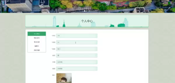 个人中心功能:用户可在个人中心更新个人信息,并对“我的发布”、“考试记录”、“错题本”、“我的收藏”等内容进行管理。个人中心界面如图5-5所示。