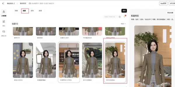 随后,配置数字人所处的虚拟环境背景。本例中选用“原木休闲角”场景,旨在提升面试过程中的真实感与亲和力,增强候选人信任度。