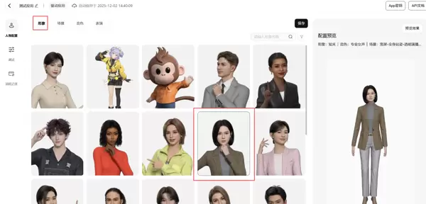 进入应用详情页,选择“角色配置”模块。平台内置了多种高精度 3D 角色模型。针对 AI 面试官这一使用场景,我们优选一位形象专业、气质干练的“职场精英”型数字人,以契合企业招聘所要求的正式氛围。