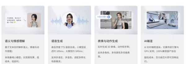 | 高质量交互 | 依托文生动作大模型,数字人的口型、表情与肢体动作均由对话内容实时驱动,呈现电影级拟真水准与细腻情感表达。 | 文生动作大模型 |