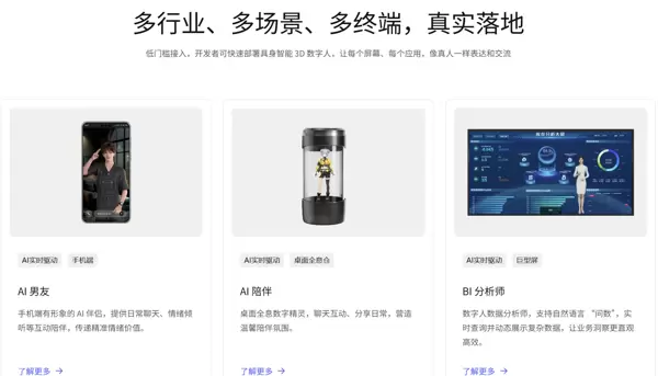 为解决这一人机交互中的体验断层,具身智能(Embodied AI)应运而生。它通过赋予AI一个可感知、可动作的“身体”——如3D数字人——实现从抽象符号到具象行为的跨越。当语言模型输出的内容能够实时驱动口型同步、表情变化与肢体动作时,智能体便具备了传达情绪与态度的能力。这种多模态融合不仅提升了交互的真实感与可信度,也为AI深入现实应用场景提供了全新路径。