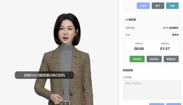 在文本输入区域输入一段带有明确指令的内容用于测试,例如:“你好,我是本次面试官。请先做一个简短的自我介绍,并谈谈你对我们公司的了解。” 点击发送后,系统会驱动数字人朗读该段文字。