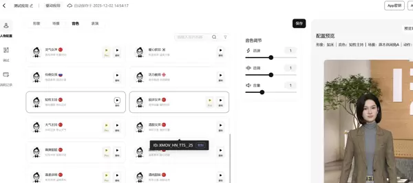 在开发初期,需完成数字人角色的选型与参数设定,包括外貌特征、着装风格、语音类型等,确保其符合企业雇主品牌形象,并适用于目标岗位的初面场景。