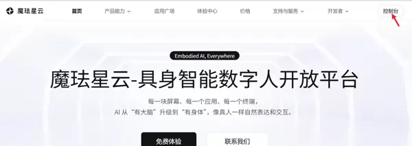 首先,访问 魔珐星云开发者平台,登录后点击页面右上角进入控制台界面。