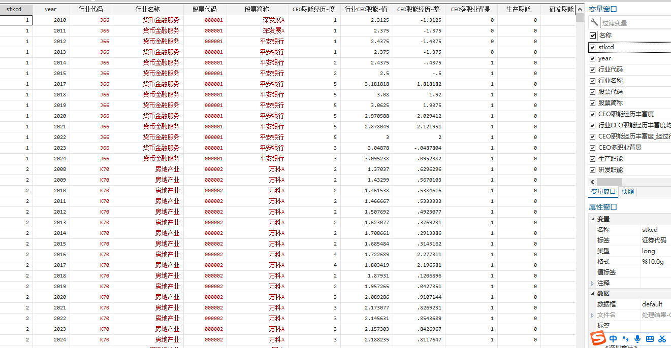 - CEO职能经历丰富度:CEO职业数量、职能数量、复合职能,取值1 - 9。数值越大,CEO职能经历越丰富,具备更多职能背景。(段云龙等2023,汤倩等2021,毛聚等2022)