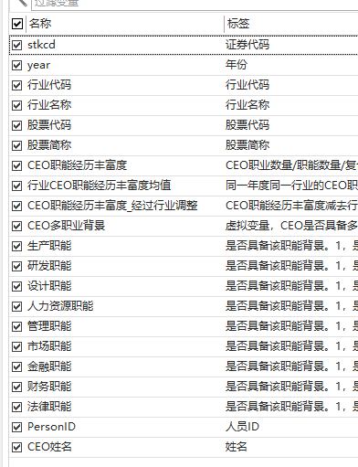 - CEO多职业背景:虚拟变量,CEO是否具备多职业背景。1,是;0,否。(汤倩等2021,毛聚等2022)