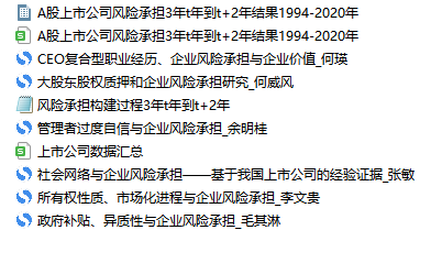 参考文献:CEO复合型职业经历、企业风险承担与企业价值_何瑛大股东股权质押和企业风险承担研究_何威风政府补贴、异质性与企业风险承担_毛其淋社会网络与企业风险承担——基于我国上市公司的经验证据_张敏所有权性质、市场化进程与企业风险承担_李文贵管理者过度自信与企业风险承担_余明桂