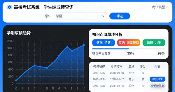 - 支持导出PDF格式成绩单,附带校徽水印以增强正式性。