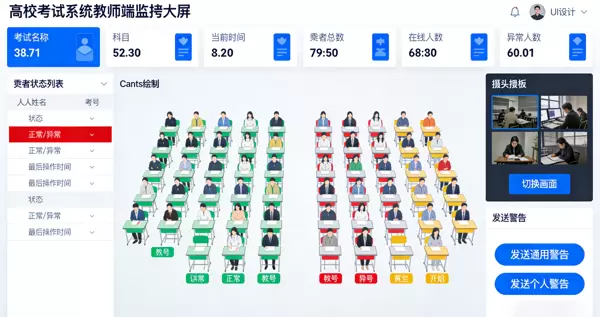 技术实现:基于WebSocket协议实现实时数据推送,利用Canvas绘制动态考场座位图。