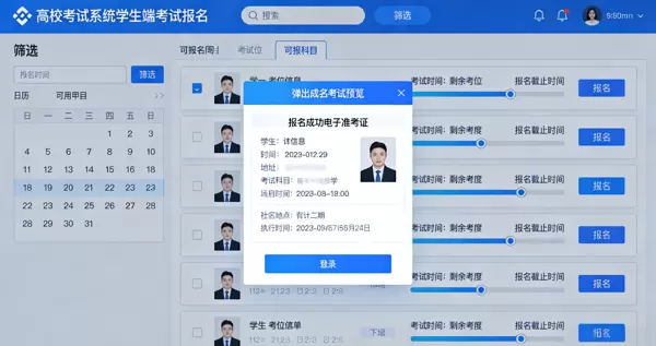 - 展示所有可报考科目信息,包含考试时间、剩余考位数量及报名截止时间;