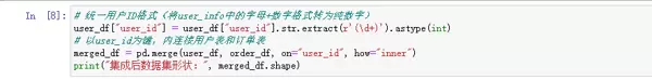 本例采用内连接方式,仅保留同时存在于用户表和订单表中的记录,避免引入无对应关系的无效数据干扰后续分析。