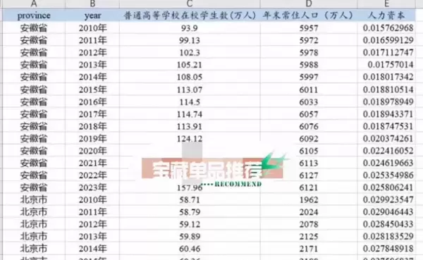 核心指标包括:普通高等学校在校学生人数、各地区年末常住人口总数,以及基于前两项数据计算得出的人力资本水平(即每单位常住人口中高校在校生所占比例)。该指标可有效反映各地教育发展程度与人力资本积累状况。
