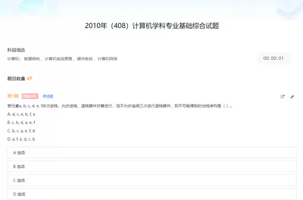 若元素 a, b, c, d, e, f 按顺序依次入栈,允许进栈与退栈操作交替进行,但不允许连续三次执行退栈操作。在该限制条件下,以下哪一个出栈序列是不可能得到的?