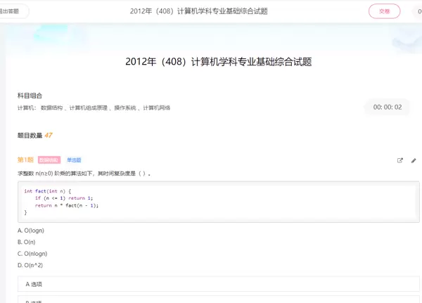 题目一:求整数 n(n ≥ 0)阶乘的算法,其时间复杂度是( )。