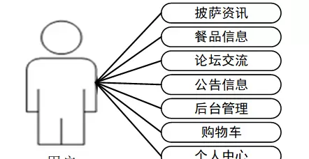普通用户可执行注册登录、浏览披萨资讯与餐品详情、参与论坛讨论、查看公告信息、访问后台公开页面、使用购物车功能、管理个人中心等操作。具体用例分析见图3-2。