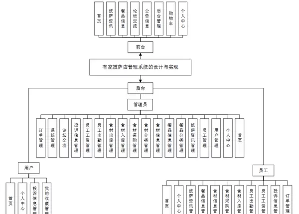“有家披萨店管理系统”的建设旨在为披萨门店提供一体化的信息管理解决方案。通过对基础业务数据的集中管理,实现基于角色权限的信息差异化展示。根据前期需求分析结果,系统主要功能模块已初步确定,整体架构如图4-1所示。
