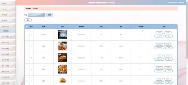 当管理员选择“披萨资讯管理”功能时,将跳转至对应页面。在此可依据标题查询或删除披萨资讯列表,并对资讯详情执行查看、编辑、浏览评论及删除等操作。界面示例如图5-6所示: