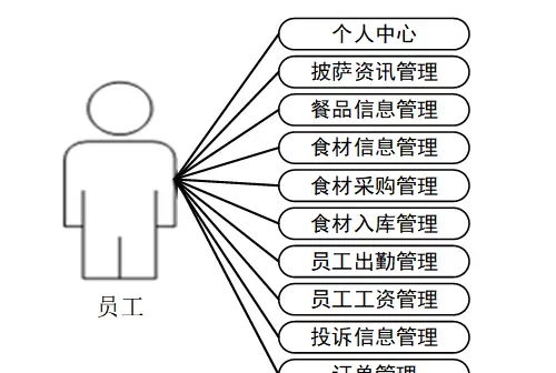 员工作为系统中的中间执行角色,能够完成注册登录、管理个人中心,同时可操作披萨资讯发布、餐品信息更新、食材信息查看与维护、参与食材采购流程、执行入库登记、记录出库情况、提交出勤数据、查看工资信息、反馈投诉内容以及处理订单相关事务。其用例结构如图3-3所示。