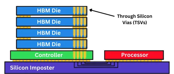 HBM的核心技术基础是基于硅通孔(Through-Silicon Vias, TSV)的3D堆叠DRAM结构。多个DRAM裸片垂直堆叠并通过TSV实现层间互联,整体连接至一个负责调度、刷新和训练的逻辑控制层(logic die)。整个堆栈通过微凸块(microbump)集成于硅中介层(silicon interposer)之上,再与主处理器(如GPU或AI加速器)相连,形成高效的2.5D封装体系。