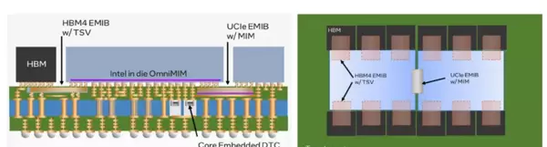 英特尔(Intel)提出的EMIB(Embedded Multi-Die Interconnect Bridge,嵌入式多裸片互连桥)提供了另一种技术路径。该方案将小型硅桥嵌入有机基板中,并通过微凸块连接相邻裸片。其中,EMIB-T版本还在硅桥内部集成了TSV,进一步优化供电能力和信号完整性。EMIB支持最大达120 × 180 mm的封装尺寸,凸点间距可小于45 μm,使得多芯粒(multi-tile)CPU、FPGA乃至未来的HBM4都能在紧凑空间内实现高效集成。