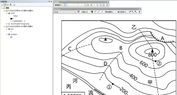 3.3 将之前创建的面和线 shapefile 添加至内容列表,并启动编辑会话。此时,ArcScan 工具条的功能按钮将变为可用状态,表示已成功激活。
